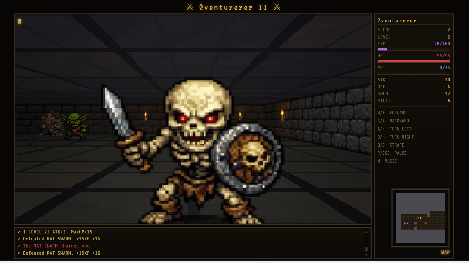 @venturerer II is a retro-inspired first-person dungeon crawler that mixes old-school raycast exploration with fast, punchy match-3 battles. Stalk through torchlit corridors, hunt treasure, survive monsters, visit shops, and push deeper into a dungeon that wants you dead.